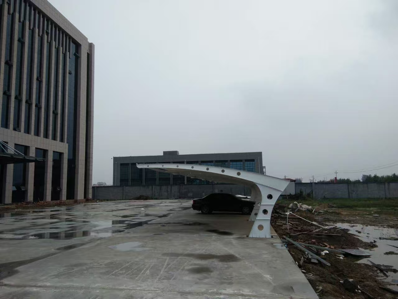造型简约大气,适配性强:可灵活设计为单坡、双坡、弧形、伞形、张拉式等多种造型,线条轻盈流畅,简约不突兀,既能满足不同场地尺寸需求,又能与小区、工厂、写字楼、学校等周边建筑风格完美融合,提升场地整体美观度。